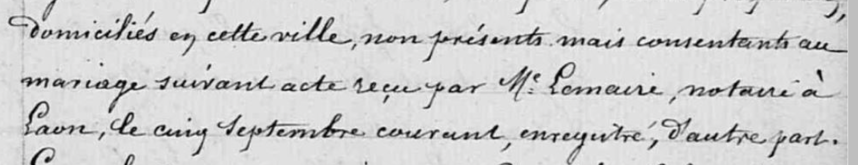 Lors de son second mariage, toutefois, son père Armand François est absent et il donne son consentement par un acte reçu de Maitre Lemaire Notaire à Laon. J’ai deux interrogations par rapport à cela, tout d’abord son père est domicilié à Laon et le mariage se déroule à Laon, Pourquoi n’est il pas présent ?