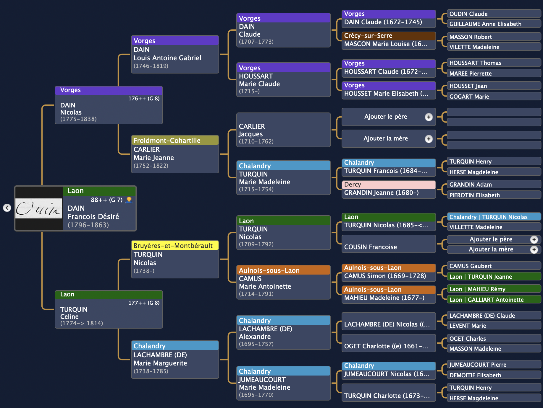 Un double « point de départ » apparait avec le couple Henry Turquin x Madeleine Herse. Seul fait sur pour ce couple, leurs dates de décès et le fait qu’ils ait eu au moins deux enfants.